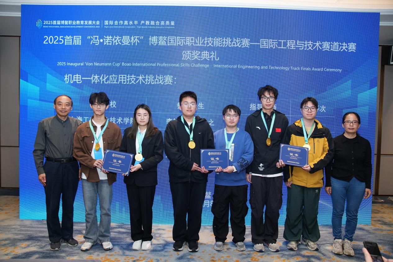 2025年12月6日至8日,在海南博鳌举办的首届“冯诺依曼杯”博鳌国际职业技能挑战赛上,我校智能制造与汽车学院学生李铖玺、奚静之在吴若尘老师的指导下,荣获国际工程与技术赛道机电一体化应用技术挑战赛金奖。