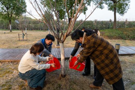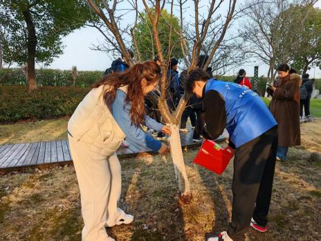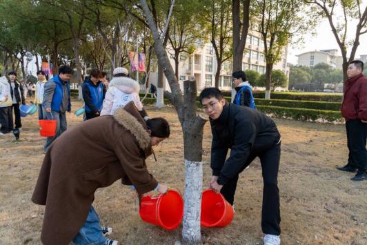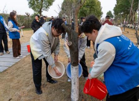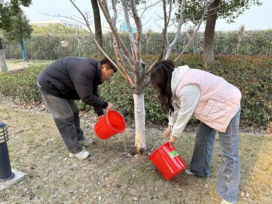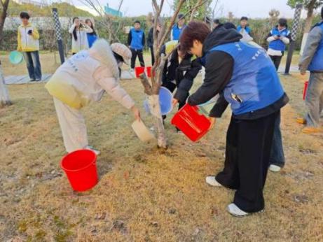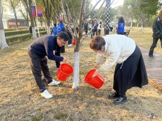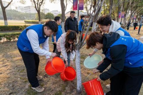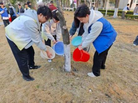 活动现场暖意融融、干劲十足。老师们率先垂范,为青年学子树立了护绿爱绿的好榜样,成为校园里一抹温暖靓丽的风景。志愿者同学们组建护绿小队,有序领取水桶、水盆等工具后,迅速投入树木养护工作。浇灌的水声、欢快的笑语在校园里交织,每一滴水都承载着对绿色的期盼,每一个忙碌的身影都诠释着青年的责任与担当。